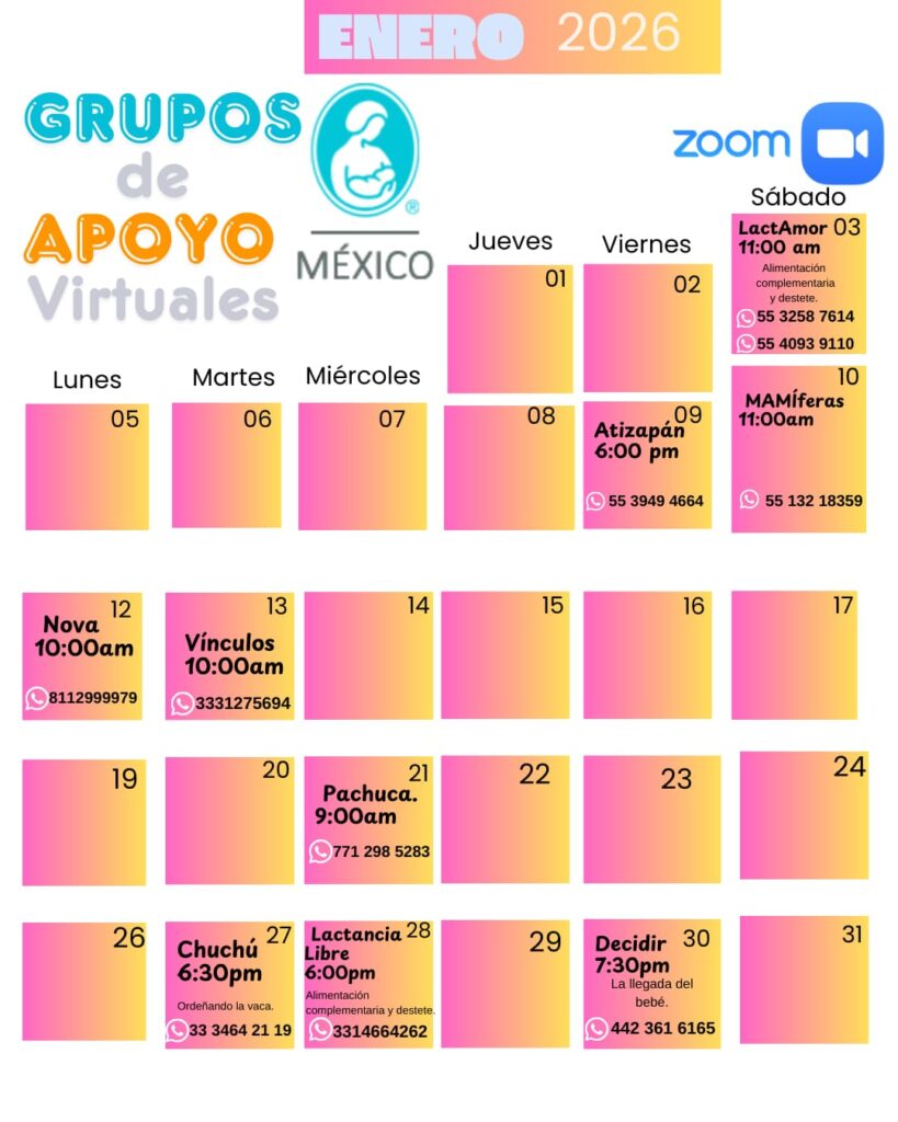Nuestros grupos de apoyo virtuales se dan en la plataforma Zoom. La duración es de 2 horas aproximadamente. Puedes venir desde el embarazo, con tu bebé, con tus familiares o amigos y amigas. Puedes sólo escuchar, participar con tus experiencias, compartir estrategias que te han funcionado y solicitar acompañamiento.